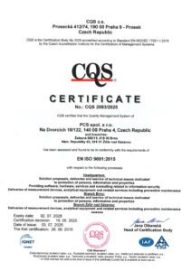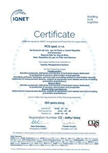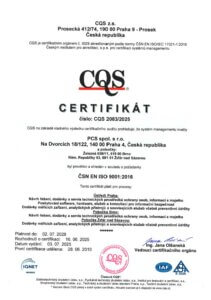 V roce 2010 jsme úspěšně zavedli systém řízení kvality dle normy ČSN EN ISO 9001:2008 (dnes ISO 9001:2015) a v červenci roku 2013 jsme úspěšně prošli procesem recertifikace. Politika kvality společnosti PCS spol. s r.o. je k nahlédnutí v dokumentu, který najdete zde.