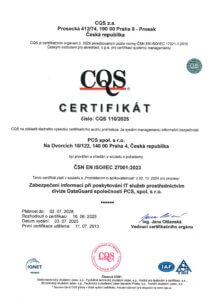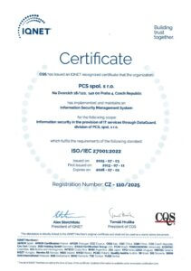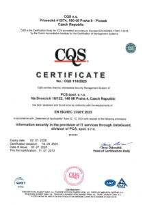 V červenci roku 2013 jsme zavedli systém řízení bezpečnosti informací dle normy ČSN EN ISO 27001. Politika bezpečnosti informací PCS spol. s r.o. je k nahlédnutí v dokumentu, který najdete zde.